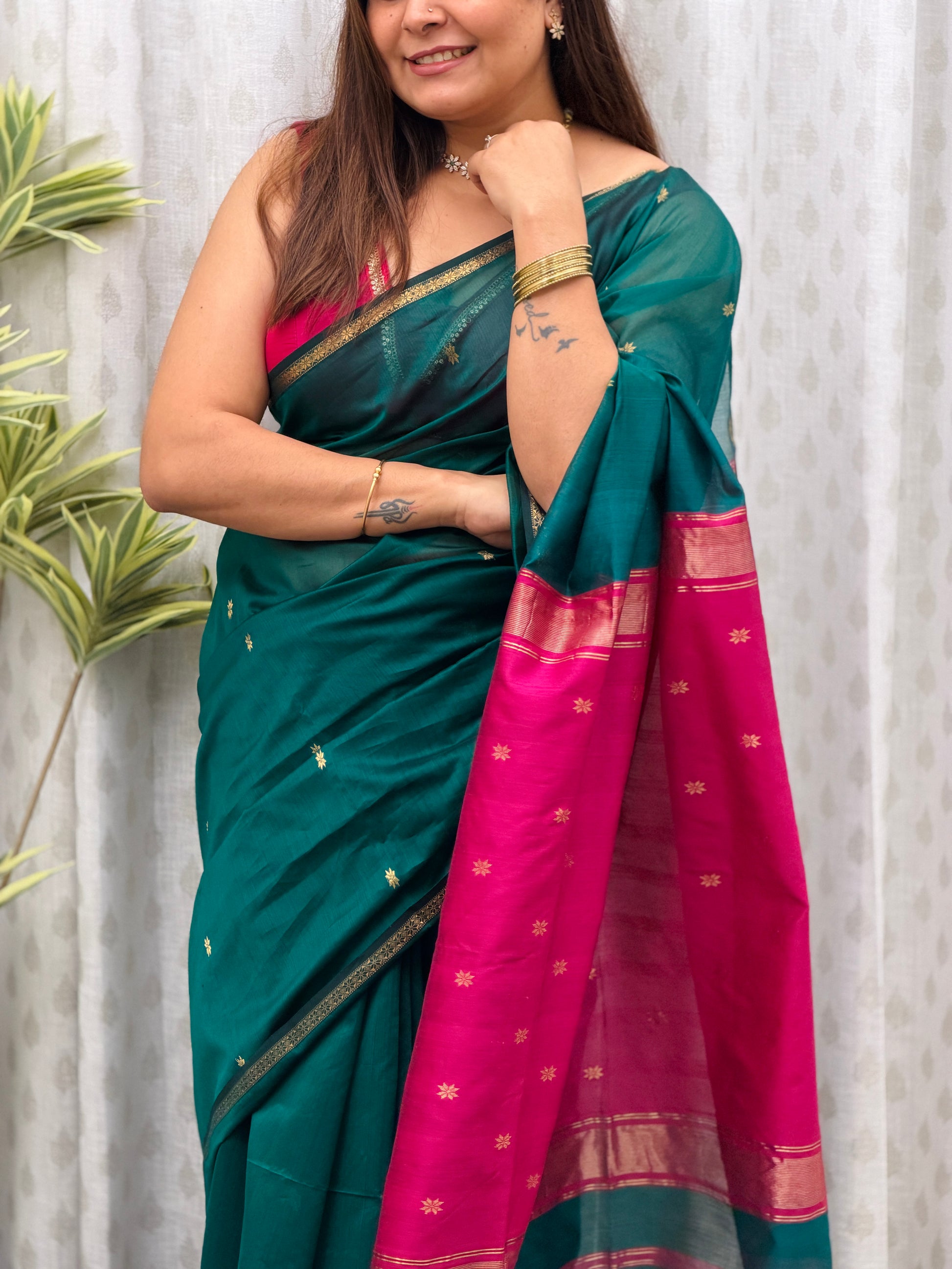 A beautiful blend of tradition and elegance, this Maheshwari handloom saree features teal colour body in contrast with pink pallu . Woven on traditional looms by skilled artisans, the cotton-silk fabric gives it a light, airy feel with a gentle sheen—perfect for festive occasions. The delicate zari border adds a touch of heritage charm.