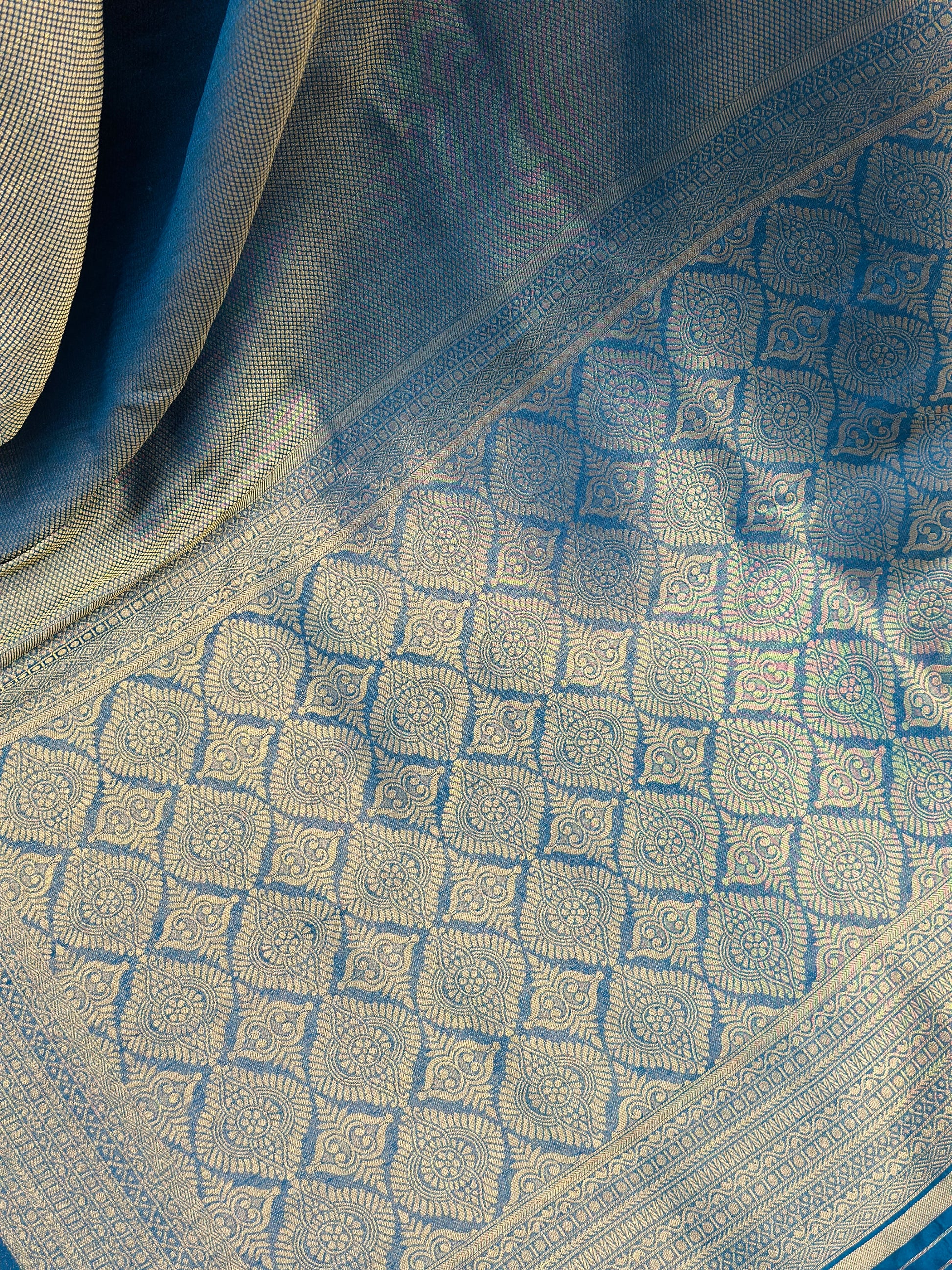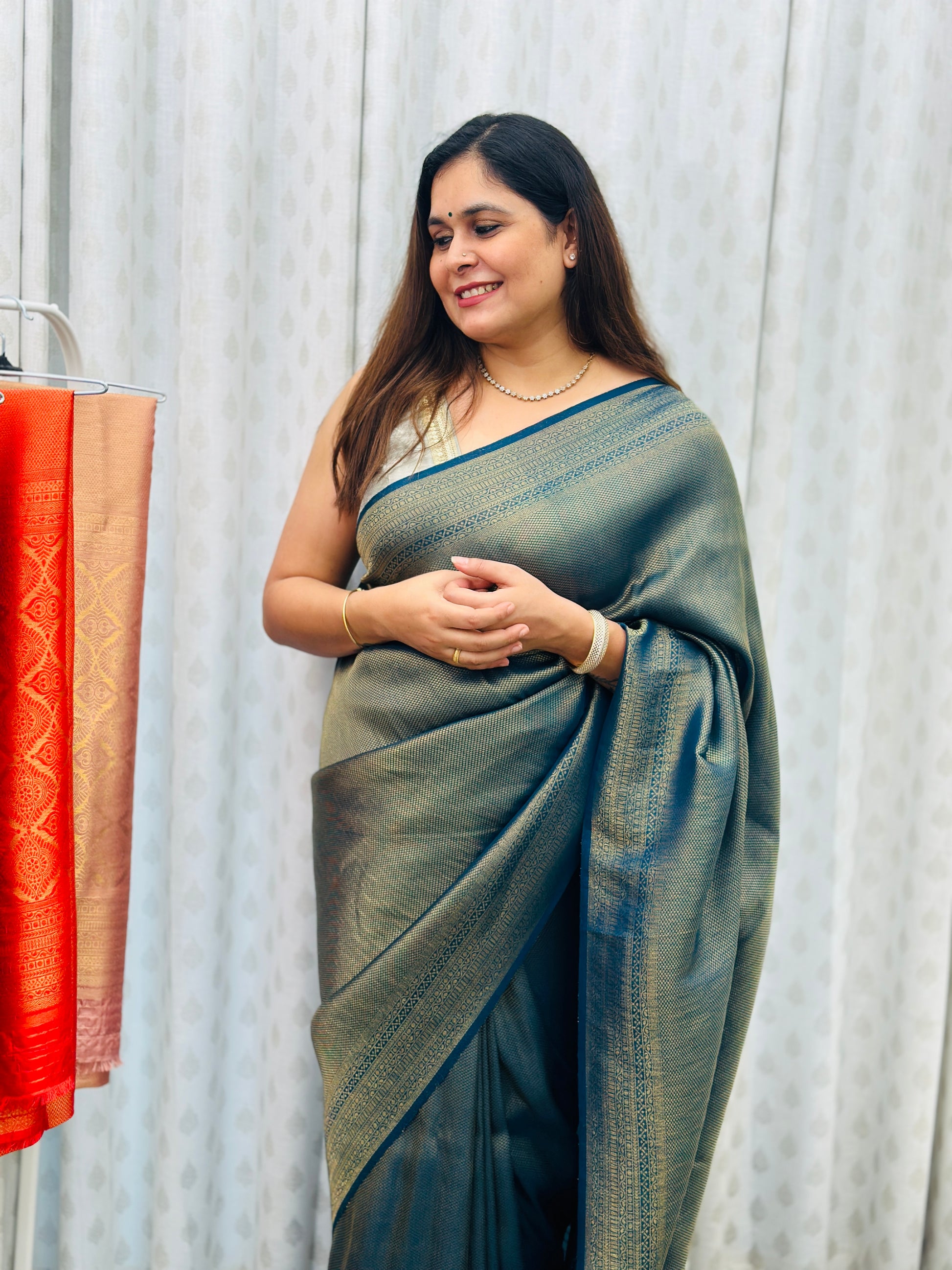 In a soothing Sea Blue shade, this soft silk Banarasi saree carries fine zari weaving and a natural sheen. Lightweight, graceful, and designed to flatter every drape.