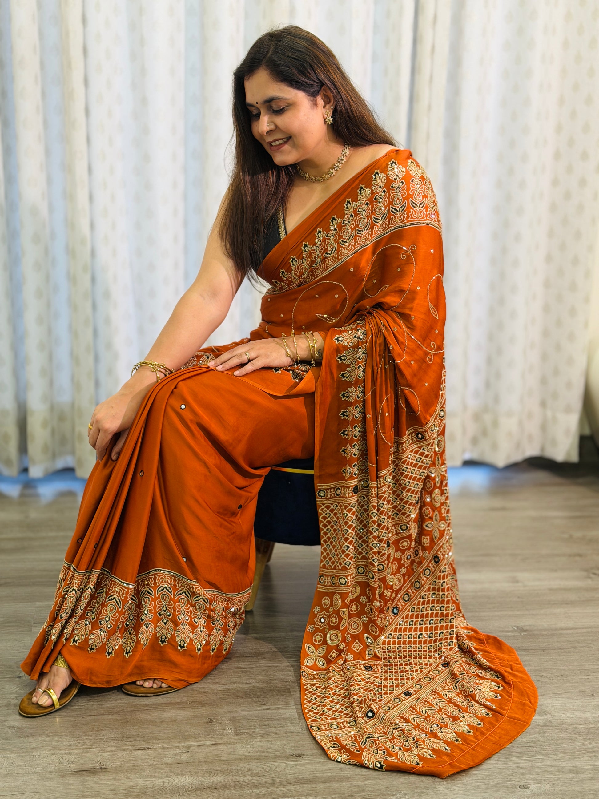 A beautiful Pure Modal Silk saree featuring authentic handblock Ajrakh, enhanced with delicate mirror work hand embroidery on the pallu and borders. Each mirror is carefully hand-stitched, not glued, ensuring durability and fine craftsmanship. Soft, elegant, and timeless—perfect for festive and special occasions.