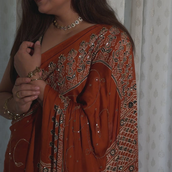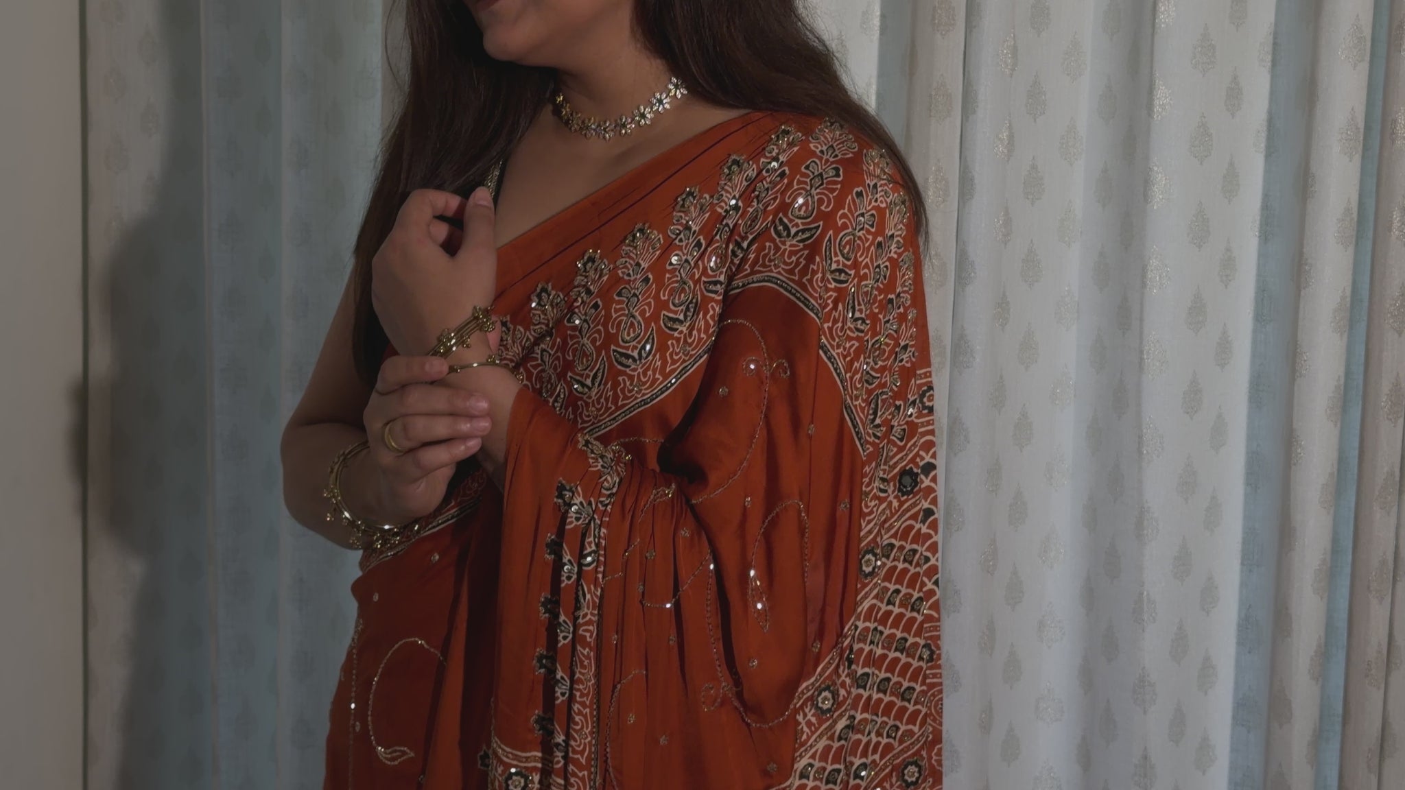 • Work: Handblock Ajrakh with embroidery and mirror work