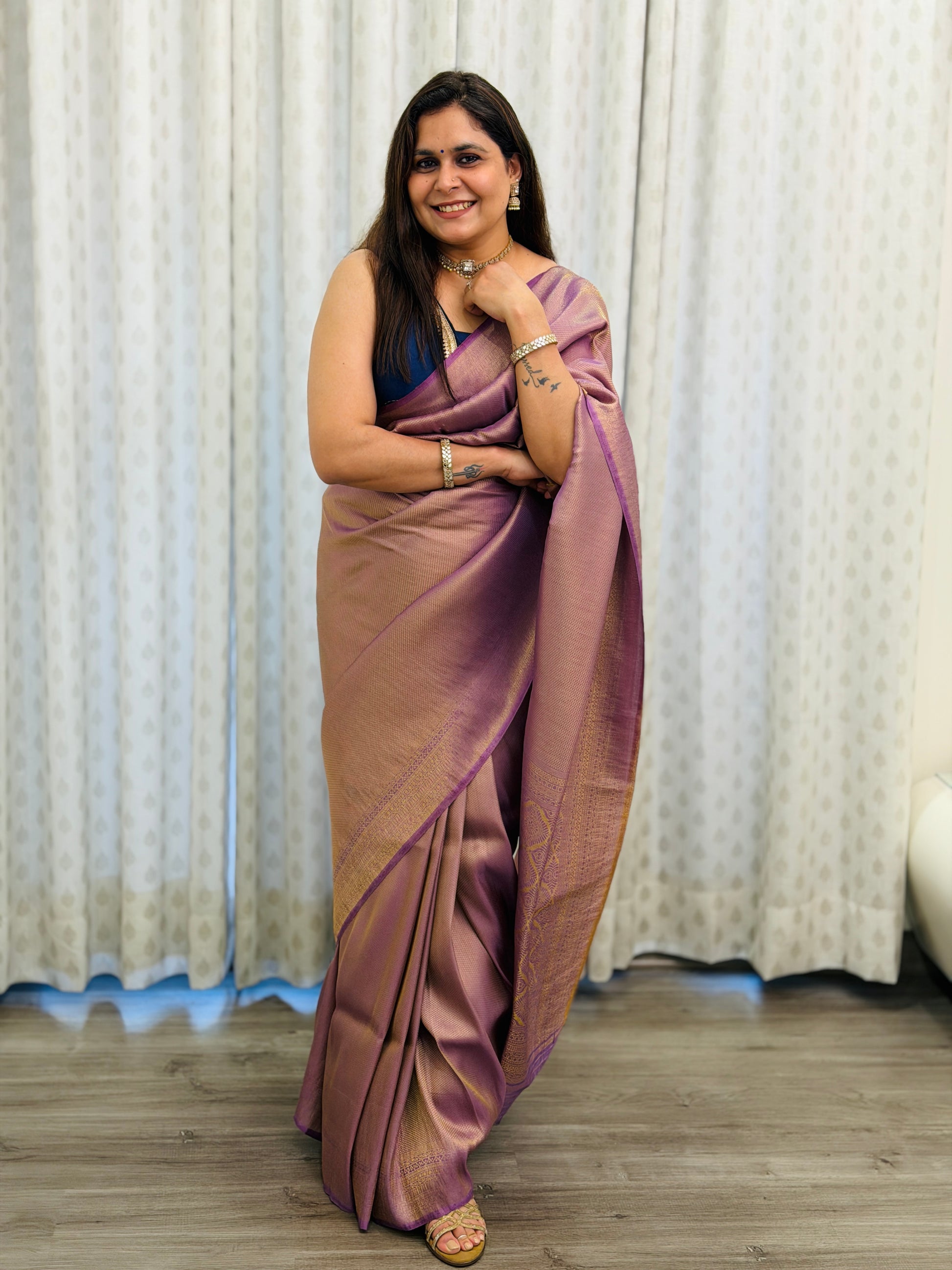 In a soothing Lilac shade, this soft silk Banarasi saree carries fine zari weaving and a natural sheen. Lightweight, graceful, and designed to flatter every drape.